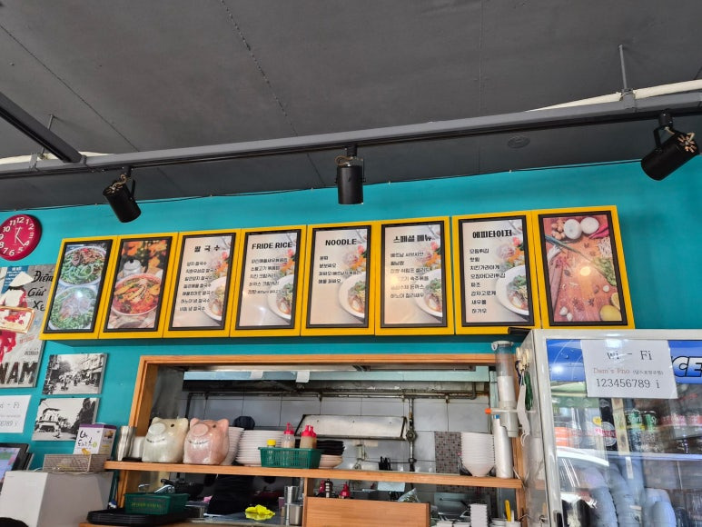 내부는 테이블 간격이 넓어서 답답하지 않고, 베트남풍 포스터와 소품이 있어 아기자기한 분위기예요.