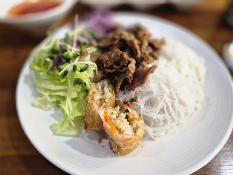 바삭하게 튀겨낸 롤, 촉촉하게 양념된 돼지고기, 신선한 채소, 그리고 넉넉한 면까지 구성이 정말 알차요.