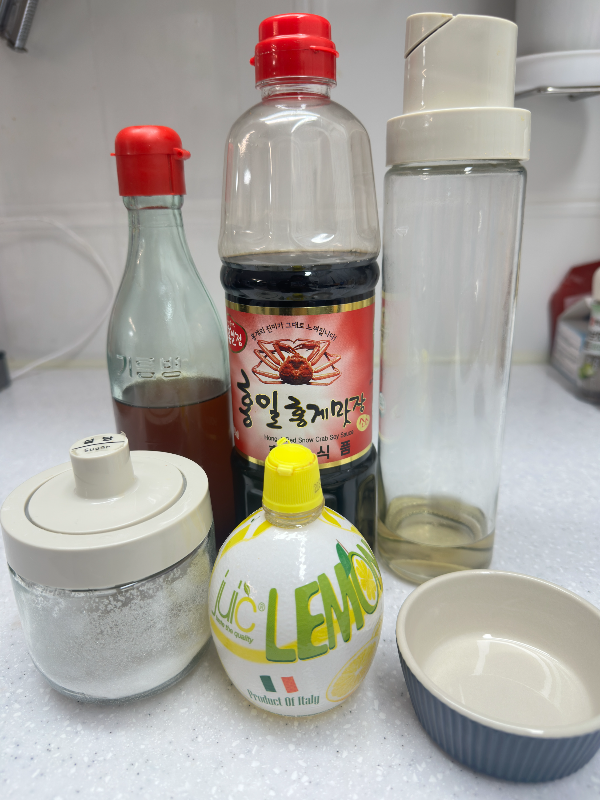 - 달짝지근한 간장양념장 : 간장 3T, 맛술 2T, 다진마늘 1.5T, 설탕 1T, 참기름 1T, 레몬즙 3T, 후추 약간