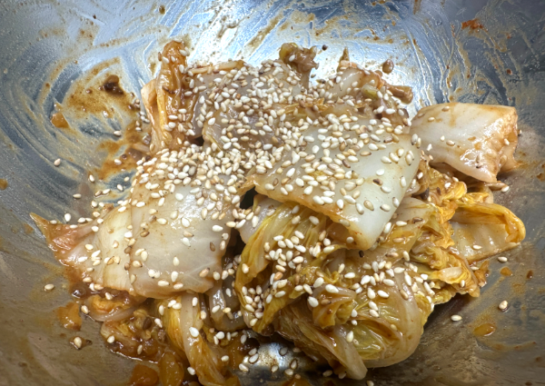 - 양념이 골고루 묻으면 깨 1큰술을 넉넉히 뿌려 한 번 더 가볍게 섞기.