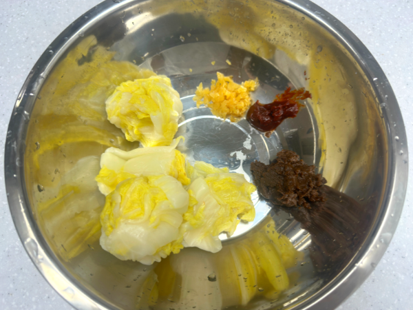- 물기를 꼭 짠 배추를 양념장 볼에 넣어요.