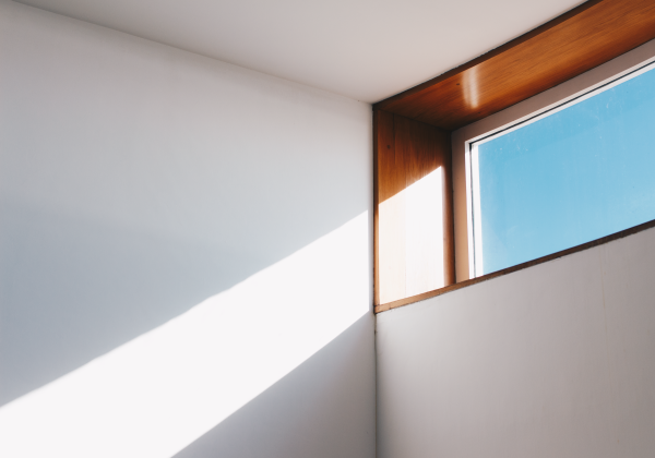 원목 테이블, 햇살 들어오는 벽, 커튼 뒤의 부드러운 그림자